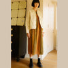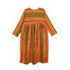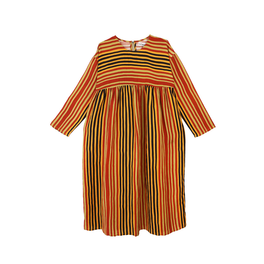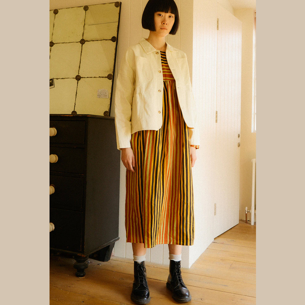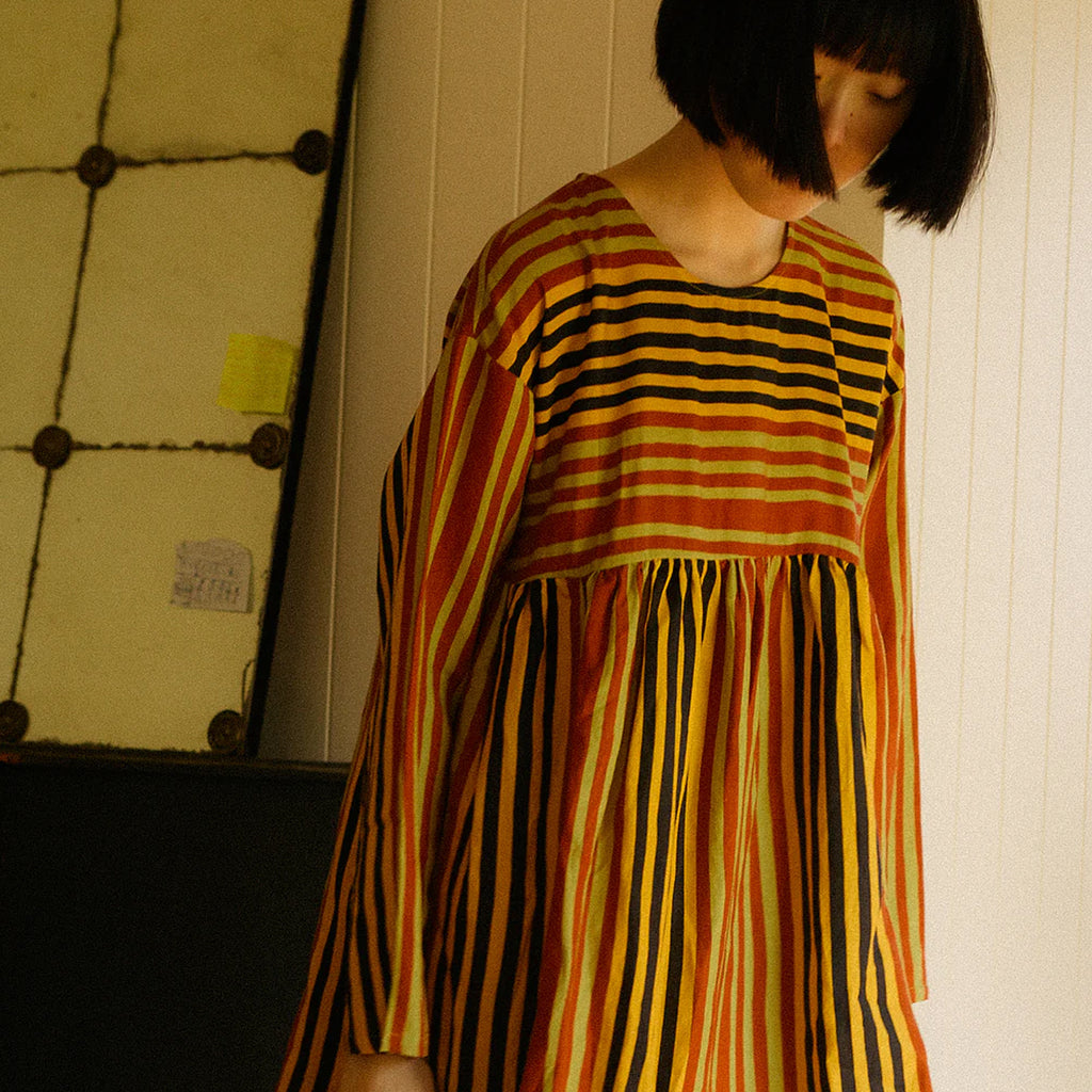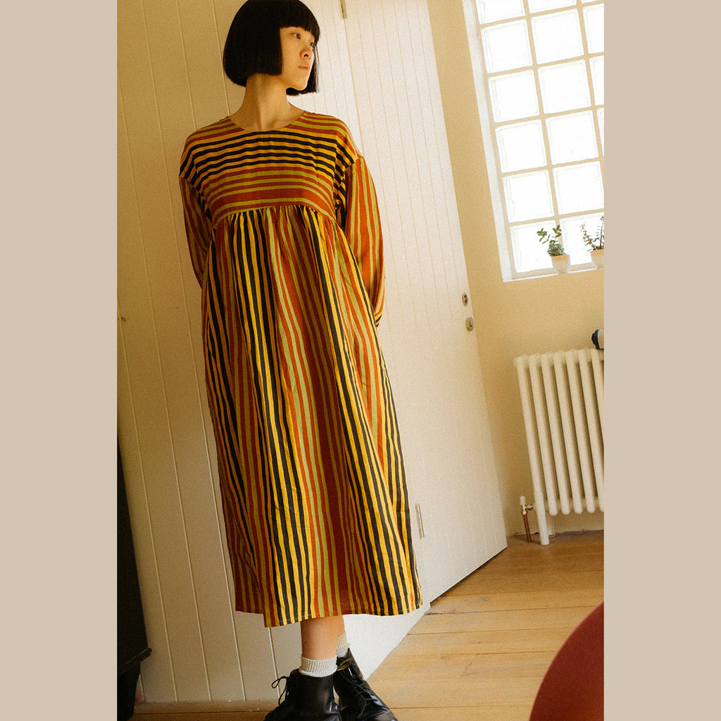 The Alder Dress is a midi length dress with a spacious relaxed fit, in a soft linen rayon blend fabric. Features an empire waistline gathered below the bust adding volume to the skirt. With longsleeves, side seam pockets, a round neckline fastened with a zip at the back. In our earthy Painter's Stripe print.