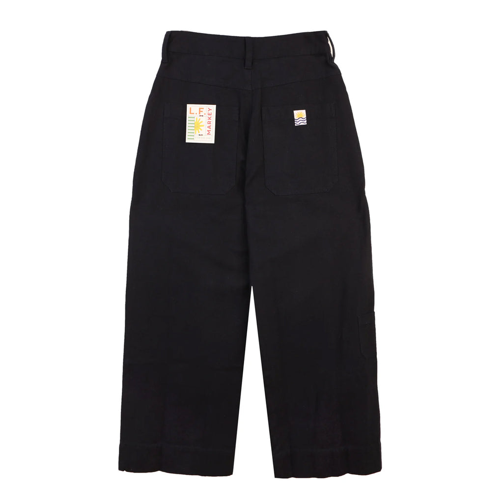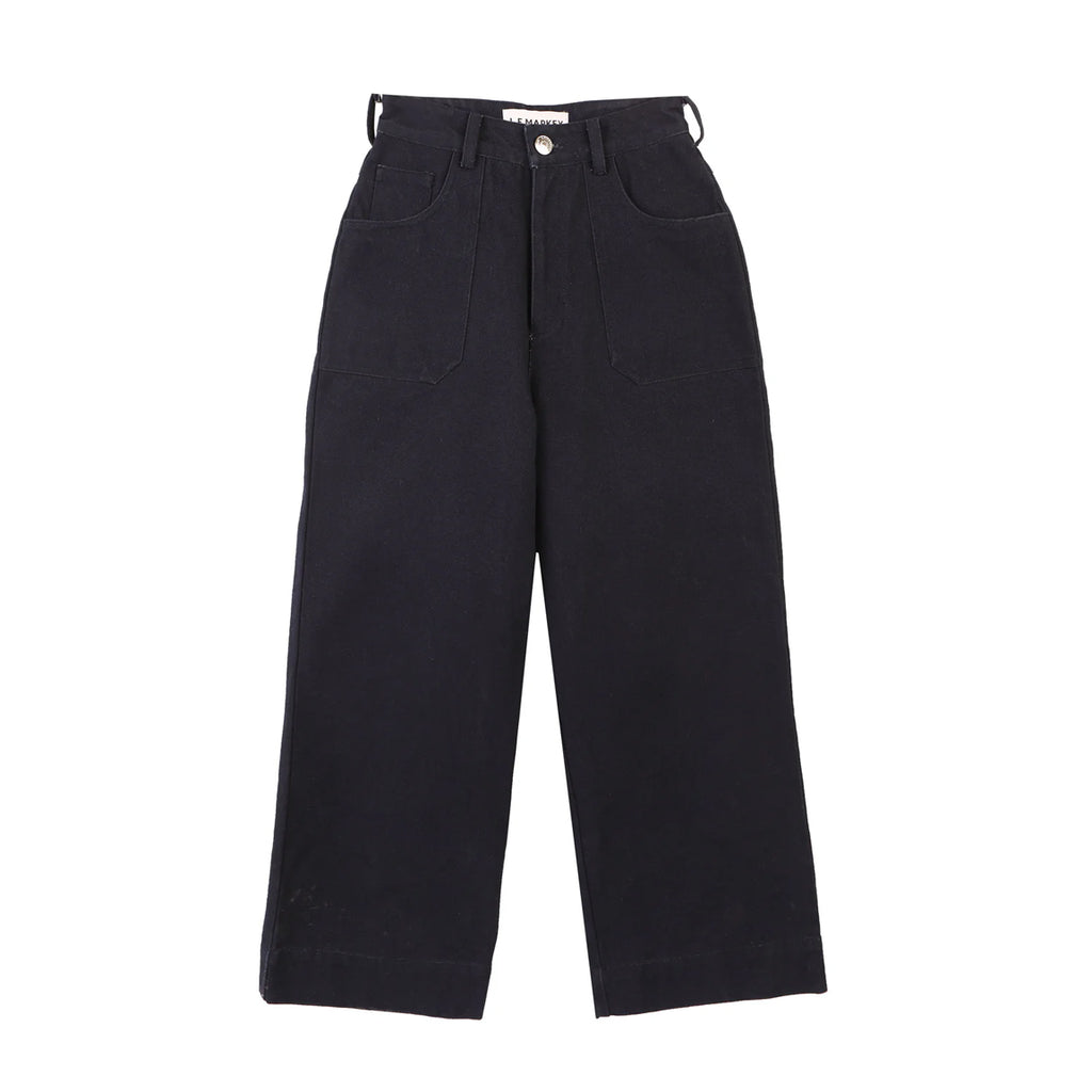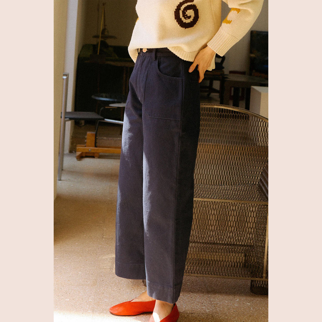 The Carpenter Trouser is a classic workwear staple, fitted at the waist with a straight cut leg. Made from a robust navy cotton canvas. Features angular utility pocket detailing and our small sun and wave logo on the back.