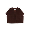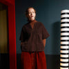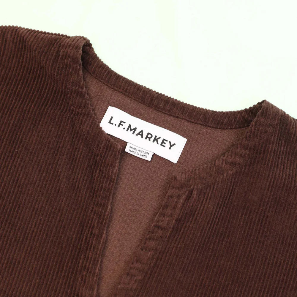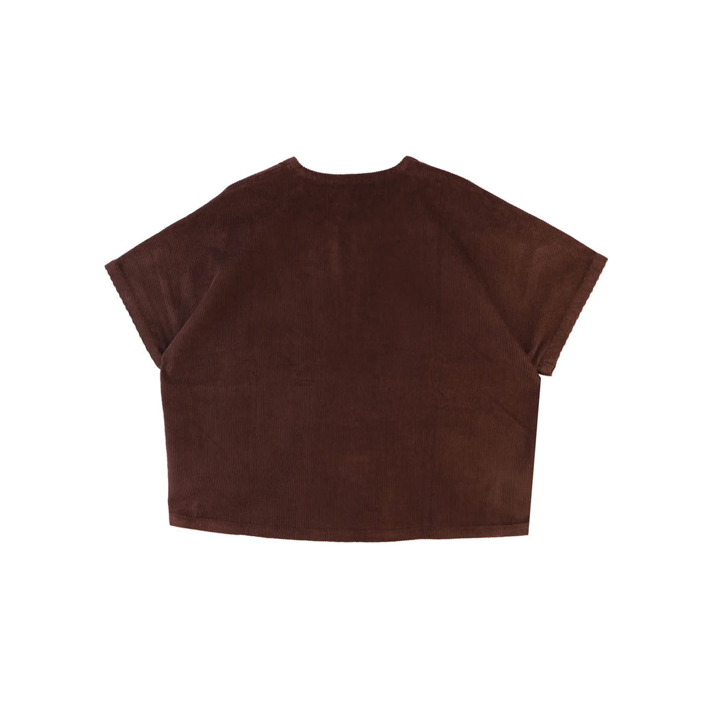 The Trevor Top is a wide-fit, boxy square shape top with a slight crop and short sleeves. Featuring a low v-neckline and front patch pockets. Made from a deep umber brown cotton corduroy.