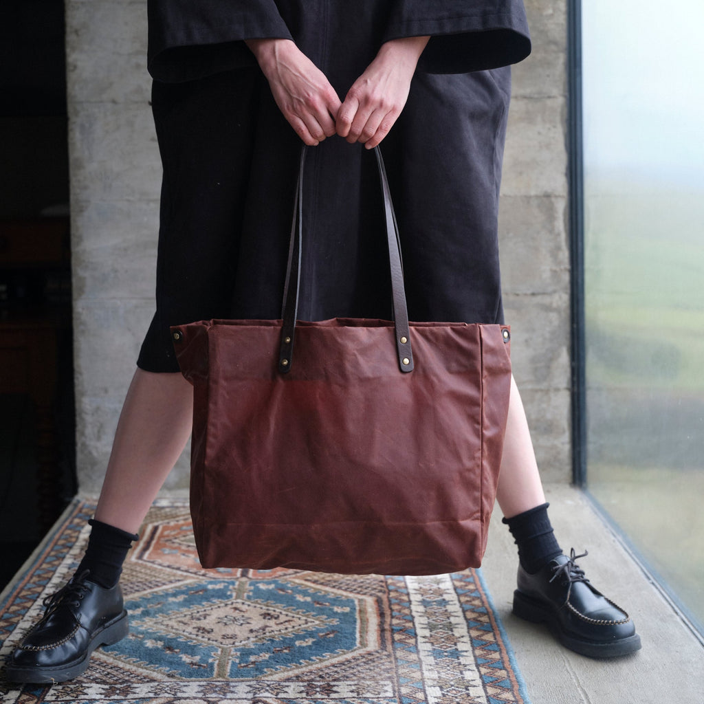 This is made using waxed cotton from Halley Stevenson, who have been making high quality cloth in Dundee since 1864. A classic heritage cloth, waxed cotton is water and wind resistant, but also breathes well. This makes it perfect for everyday wear, be that in a rain mac or a handbag.