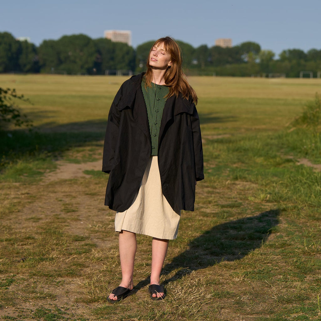 A Kate Sheridan staple, The Batwing Coat is a timeless, practical and minimal design. A modern twist on the traditional English heritage rain mac, this features an oversize fit, batwing sleeves, a large hood and deep side pockets. Fasten by overlapping the front panels that button up on the shoulders. Long sleeves can be turned up to reveal the lining. The Batwing Coat is a popular companion on bike rides, dogwalks or anytime you want to be comfortable and dry as well as look good. Made in the North of England from water resistant British waxed cotton with slightly antique look finish, which will age beautifully with wear.