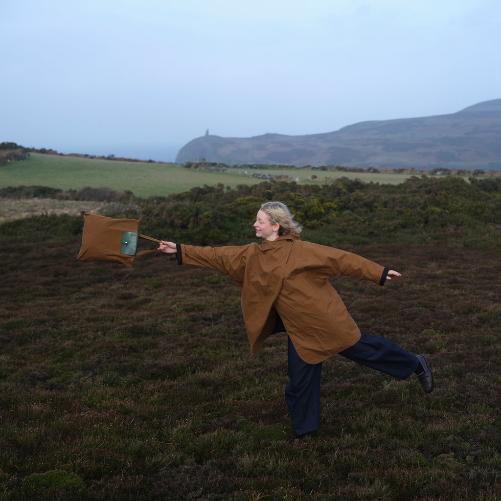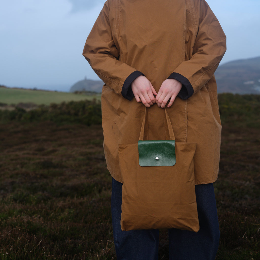 This is made using waxed cotton from Halley Stevenson, who have been making high quality cloth in Dundee since 1864. A classic heritage cloth, waxed cotton is water and wind resistant, but also breathes well. This makes it perfect for everyday wear, be that in a rain mac or a handbag.