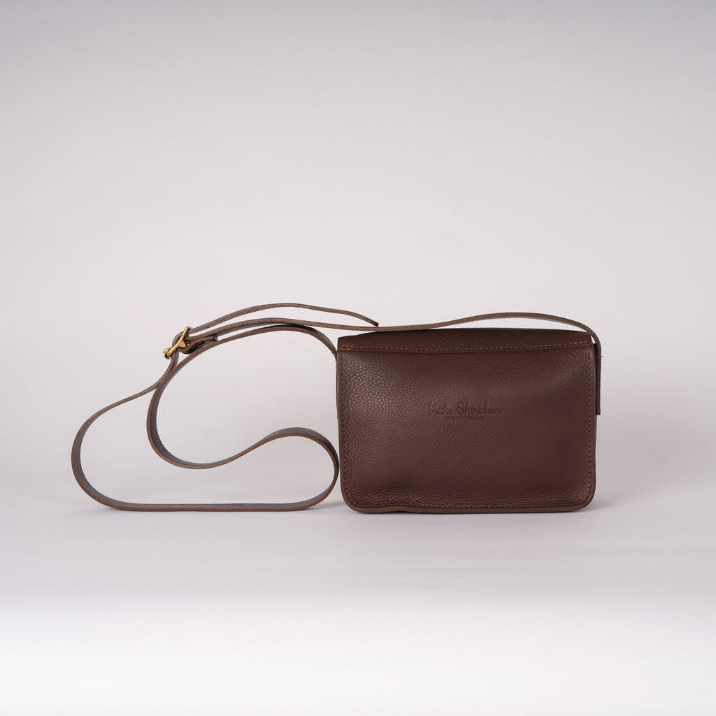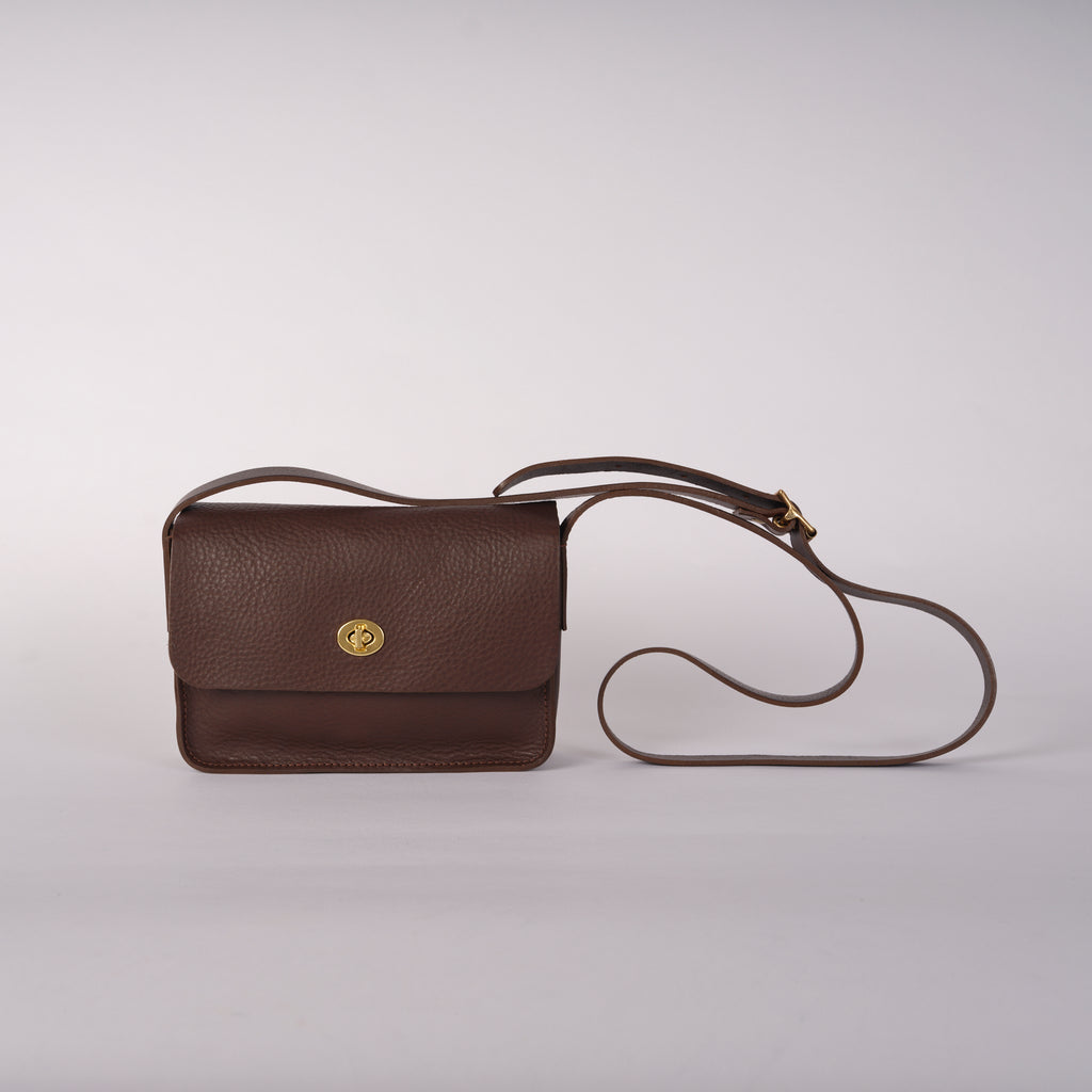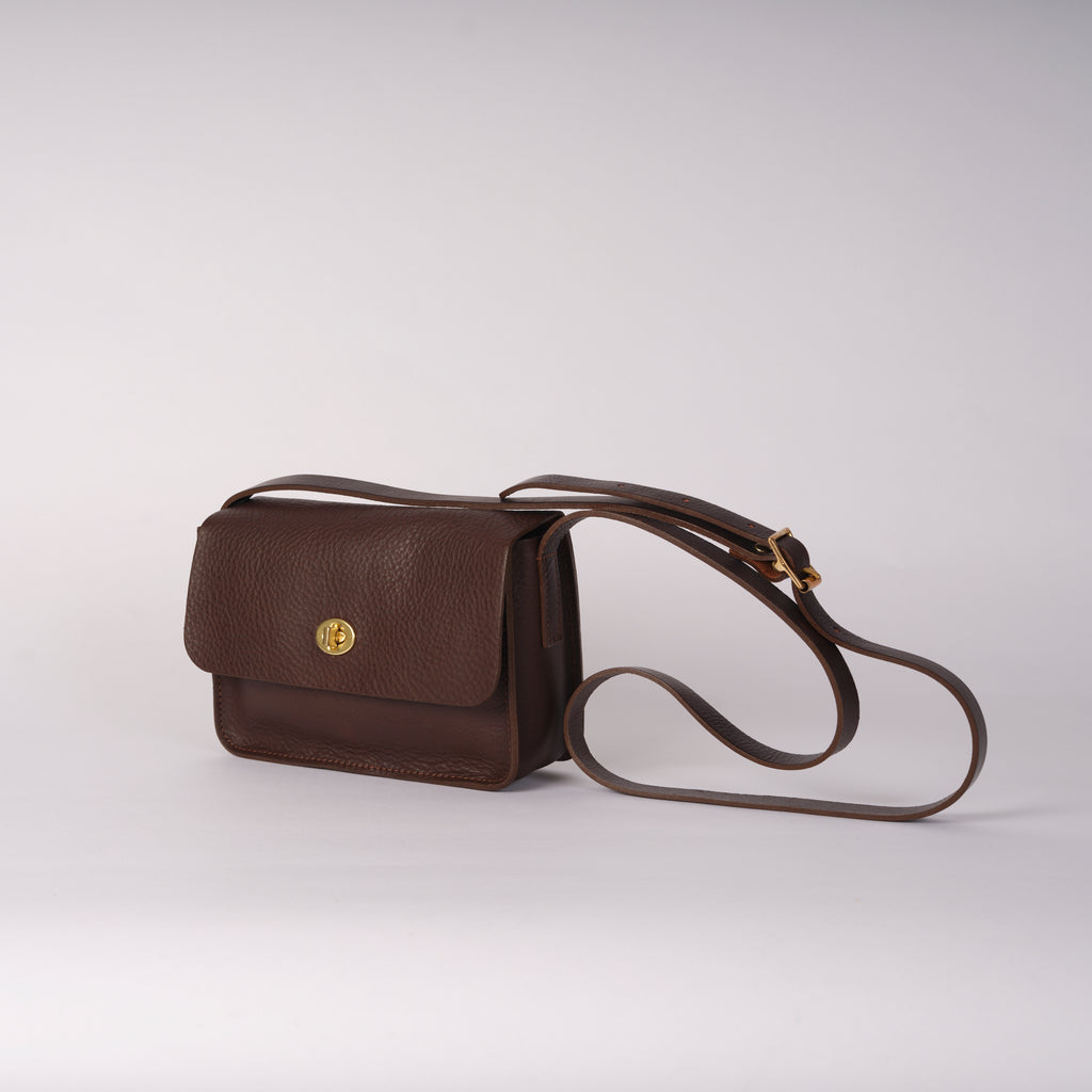 The Spin Bag is based on the body of our best-selling Tab Bag but with an elegant turn lock closure. Made in England from tumbled Italian vegetable tanned leather and Italian brass hardware.