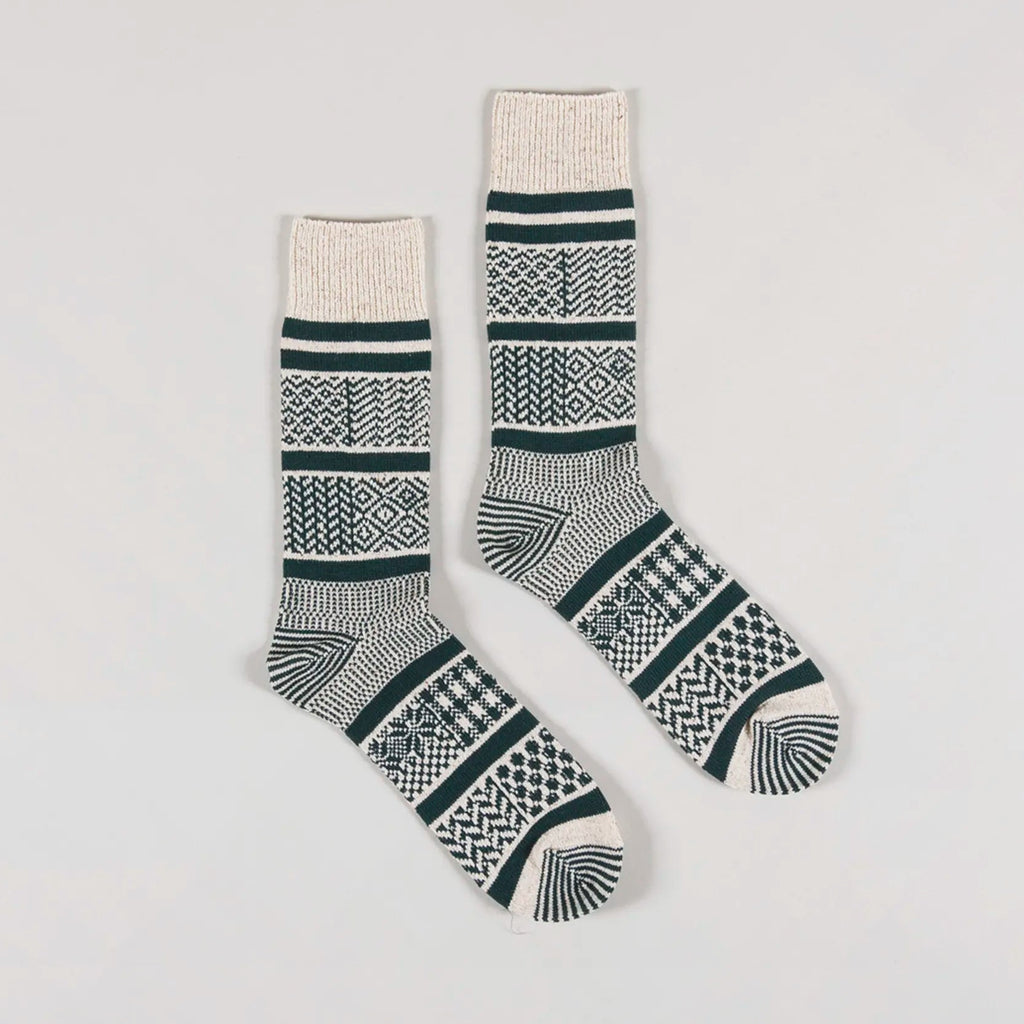 Rototo’s Multi Jacquard Crew Socks in Ivory/Dark Green offer a plush feel with a warm, mid-to-heavy weight construction.