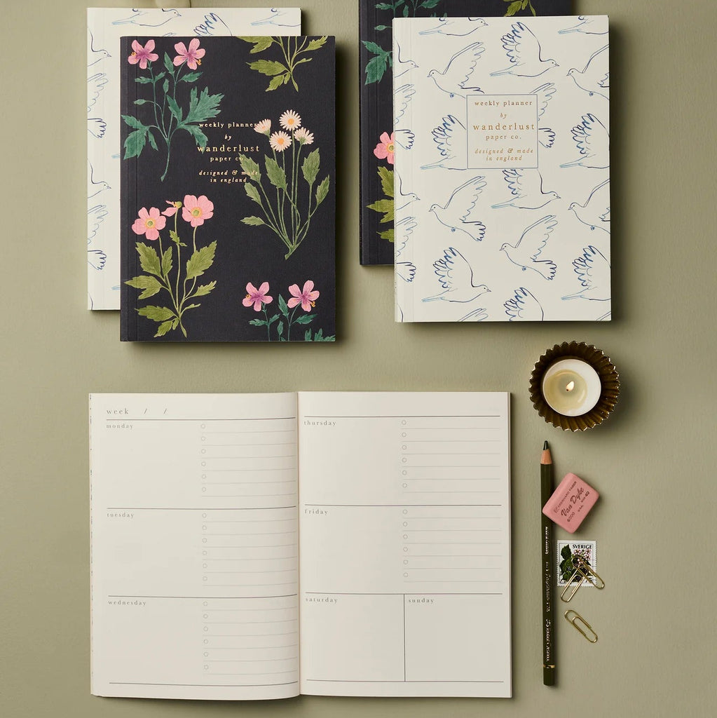 A new planner for January 2025 in a striking botanical print. These beautiful books feature our most popular patterns and are perfect for getting organised. Each book is undated which means you can start any time of the year and they feature both a monthly and weekly overview, and a notes section (please see below images of each section). They have a specialist binding which allows the book to lay open at any page without creasing the spine.