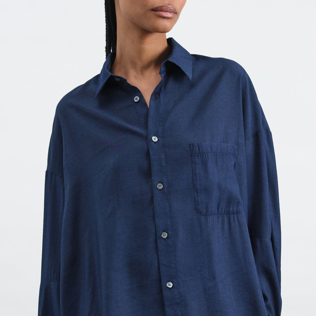 • Curved back yoke and dropped hem