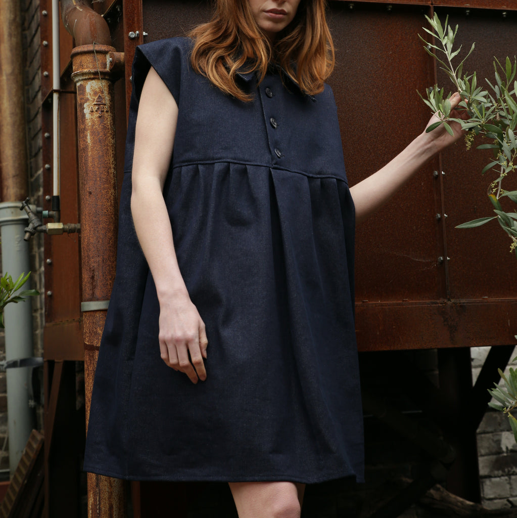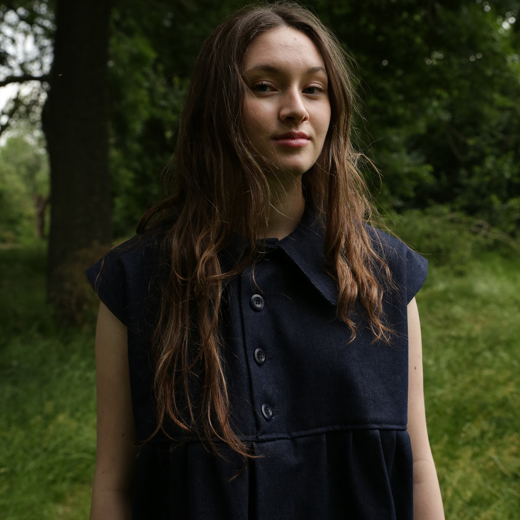 Made in England from a classic 14oz Blue Denim. The sleeveless Smock dress has a beautiful oversized collar, pleating details on the front and back, and is fastened with buttons on the front placket. This pull over dress works well on its own as well as over trousers for a casual look.