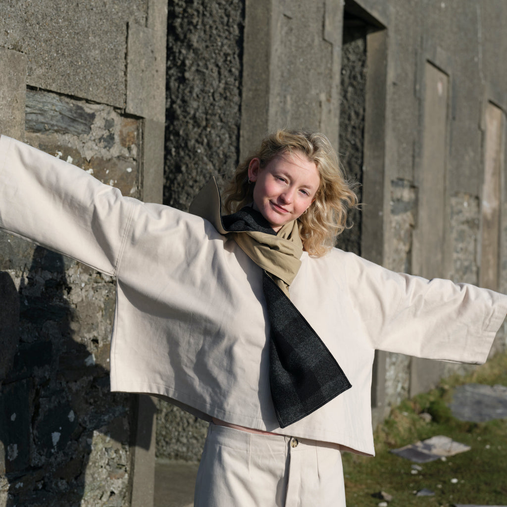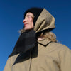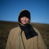 A rectangular scarf made in contrasting colours and fabrics. The luxurious wool and wind/ water resistant wax cotton works superbly together to keep you warm.