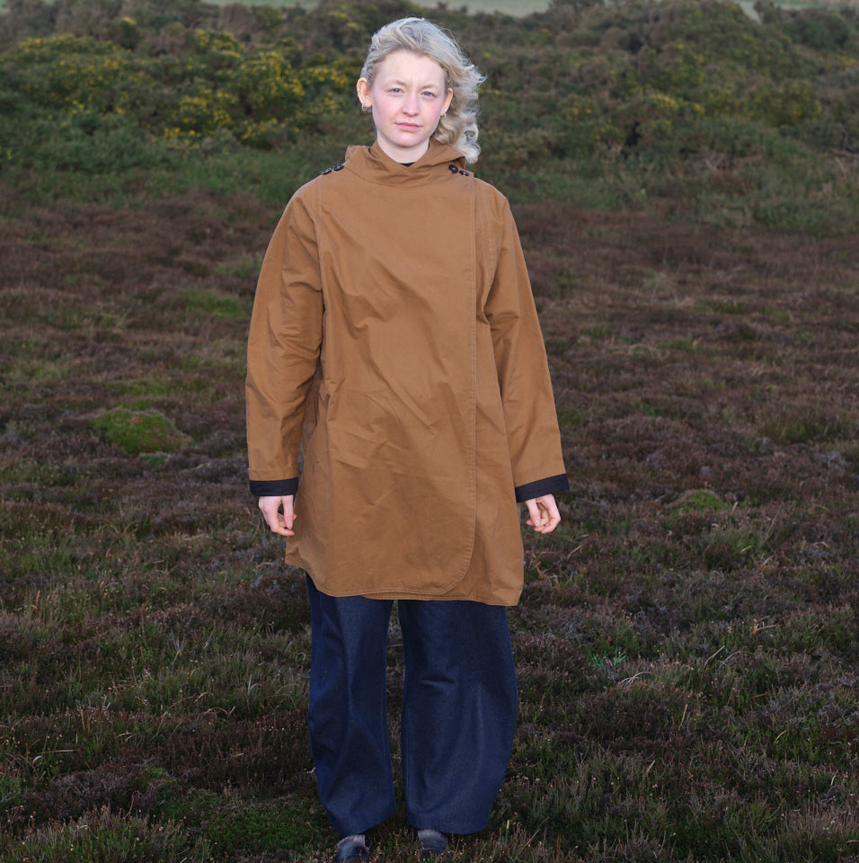 A Kate Sheridan staple, The Batwing Coat is a timeless, practical and minimal design. A modern twist on the traditional English heritage rain mac, this features an oversize fit, batwing sleeves, a large hood and deep side pockets. Fasten by overlapping the front panels that button up on the shoulders. Long sleeves can be turned up to reveal the lining. The Batwing Coat is a popular companion on bike rides, dogwalks or anytime you want to be comfortable and dry as well as look good. Made in the North of England from water resistant British waxed cotton.