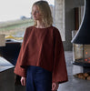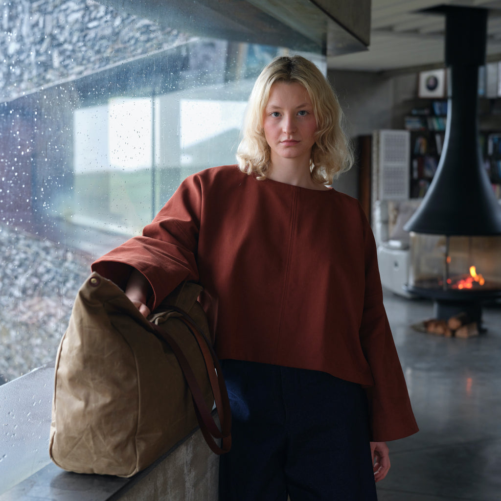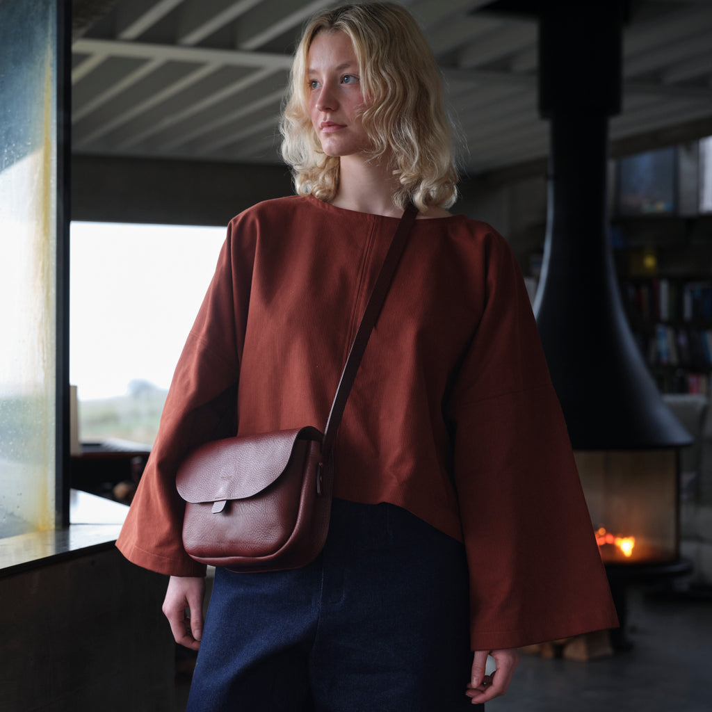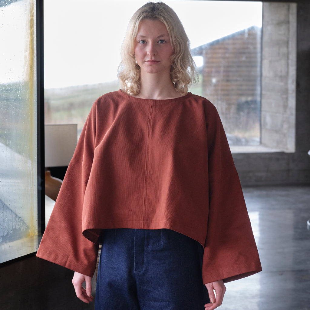 Our best-selling Edie Top has had a winter make over. Now with long sleeves and made in a luxurious reverse cord effect cloth. A simple and practical top fastened with a loop button closure.