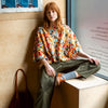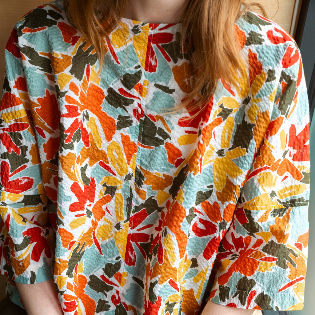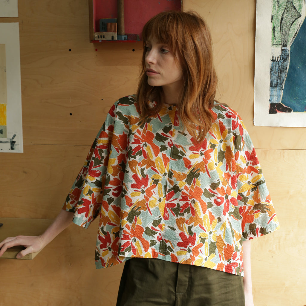 The Edie top is the perfect oversized Summer top. Short sleeved and wide fit, with feature seams on the front and back and a back neck slit with buttoned fastening. A semi-cropped hemline ideal for wearing with shorts and trousers. Crafted in the North of England from a printed Japanese seersucker cotton. Onesize fits most.