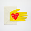 A cute hand shaped card holding a heart with a special message. Printed on high quality 300gsm card. Each card measures 11.5cm x 15cm when folded and comes in an ivory coloured envelope, the inside is left blank for your own message.